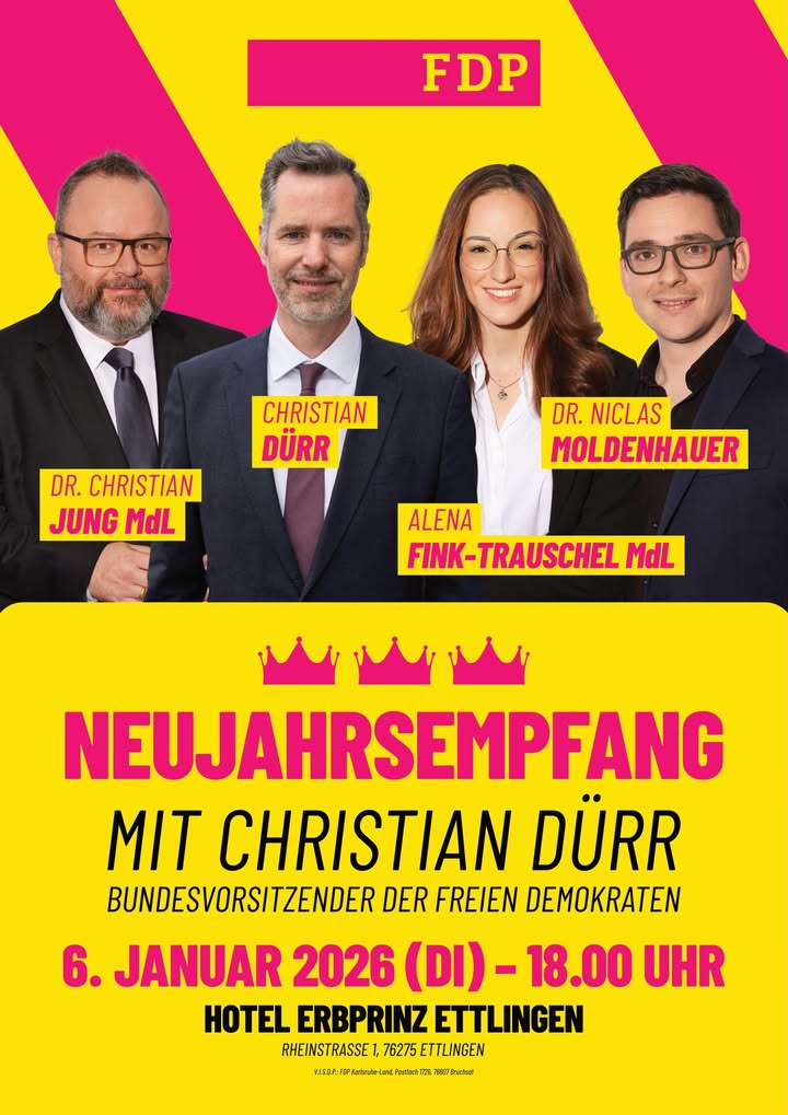 Herzliche Einladung zu unserem Neujahrsempfang am 6. Januar 2026 in Ettlingen mit FDP-Bundesvorsitzenden Christian Dürr.