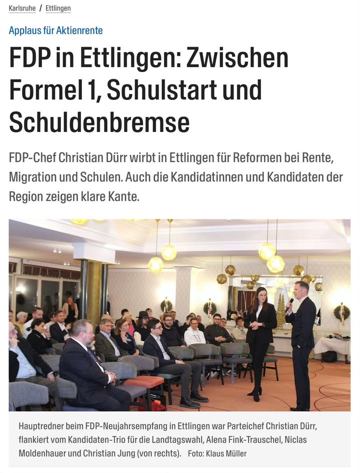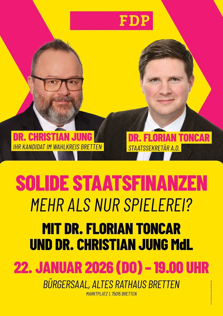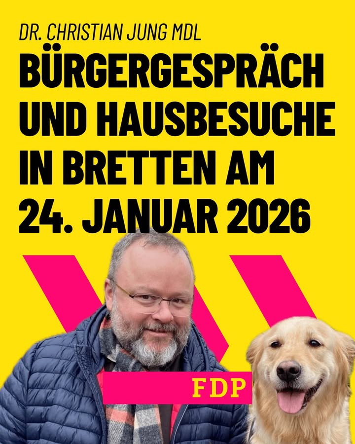 Bürgergespräch und Hausbesuche: Am 24. Januar 2026 (Samstag) ist FDP-Landtagsabgeordneter Dr. Christian Jung mit seinem Team in Bretten unterwegs. Treffpunkt für ein Bürgergespräch ist um 10.00 Uhr im Melanchthon Café (Marktplatz 14), danach folgen Hausbesuche, bei denen auch das Kandidatenprospekt von Jung verteilt wird, der wieder im Wahlkreis Bretten für den Landtag kandidiert. #fdp #bretten #bauerbach #neibsheim #büchig #diedelsheim #rinklingen #dürrenbüchig #gölshausen #ruit #sprantal (TJ)