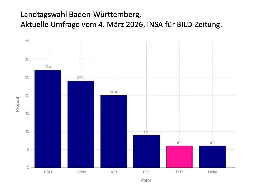 Aktuelle INSA-Umfrage vom 4.3.2026. Die FDP bleibt auch bei der vierten Umfrage in Folge (!) konstant bei 6%. Durch das neue Wahlrecht, indem die Zweitstimme entscheidend für das Wahlergebnis ist, haben die Freien Demokraten nun sehr gute Chancen, noch besser abzuschneiden. Die FDP hat in den vergangenen Wochen für ihre Inhalte zur Zukunft von Baden-Württemberg und einer klaren Koalitionsaussage für eine neue vernünftige Landesregierung der bürgerlichen Mitte geworben. Die aktuellen Schlammschlachten zwischen Grünen und der CDU zeigen, wie wichtig eine liberale Kraft in der Landesregierung und im Landtag ist. #fdp