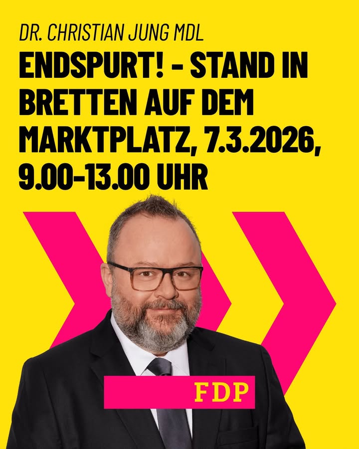 „Stillstand oder Wohlstand?“ ist nun die Frage für die Zukunft von Baden-Württemberg. Schwarz-Grün oder Grün-Schwarz wird uns nicht weiterbringen. Wir freuen uns, dass die Zustimmung zu den Freien Demokraten in der Bevölkerung weiter steigt! Wir brauchen nun dringend eine neue und vernünftige Landesregierung der bürgerlichen Mitte - mit einer starken FDP! Ich freue mich deshalb auf die vielen Gespräche und direkten Kontakte bei unserem Wahlkampfabschluss in Bretten. Wir stehen als Freie Demokraten für: • KEIN VERBRENNERVERBOT – Sie entscheiden, welches Auto zu Ihrem Leben passt. • BÜROKRATIEABBAU – einen Staat, der hilft und nicht den Alltag blockiert. • LEISTUNG, DIE SICH LOHNT – wer arbeitet, soll mehr behalten und vorankommen. • BILDUNGSVIELFALT und den ERHALT DER WERKREALSCHULE – für Bildung, die jeden besser macht. • MEHR FREIHEIT IM ALLTAG – statt immer neuer Bevormundung. AM 8. MÄRZ 2026: ZWEITSTIMME FDP!